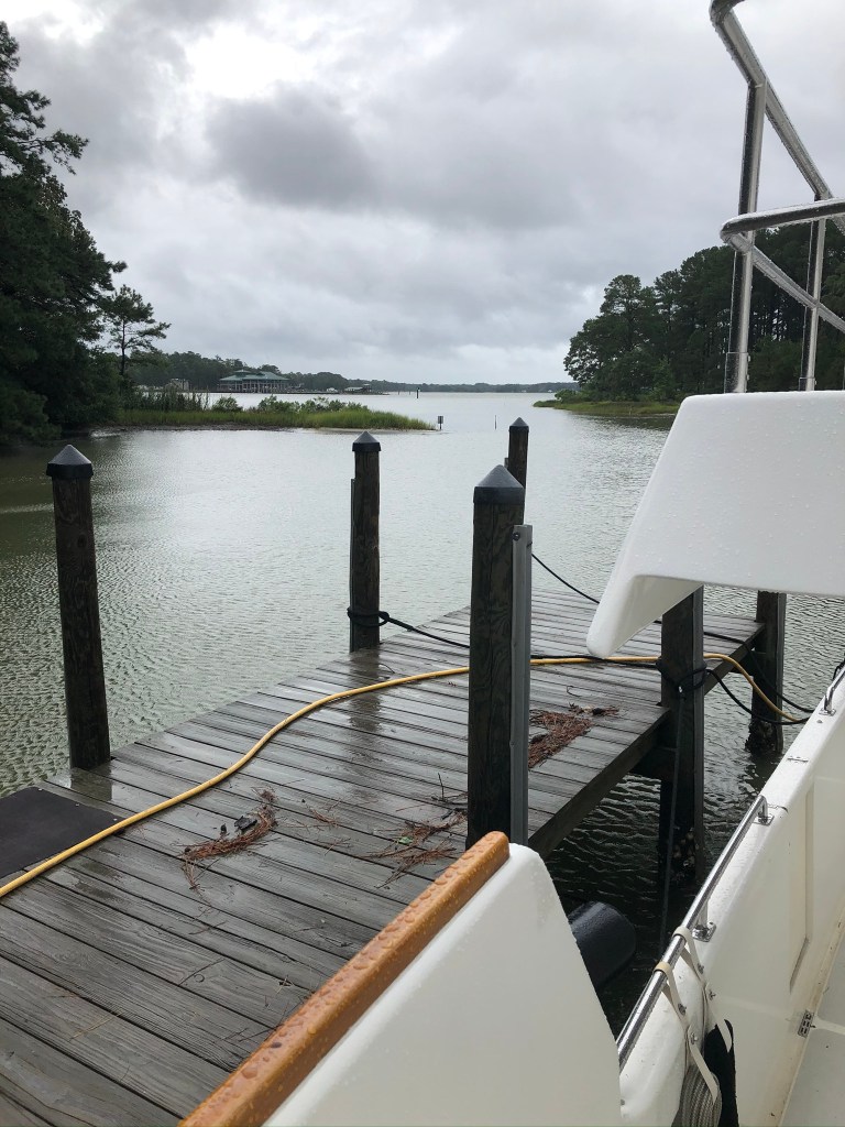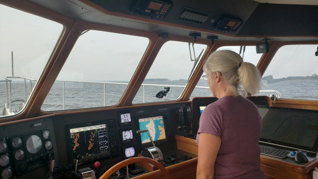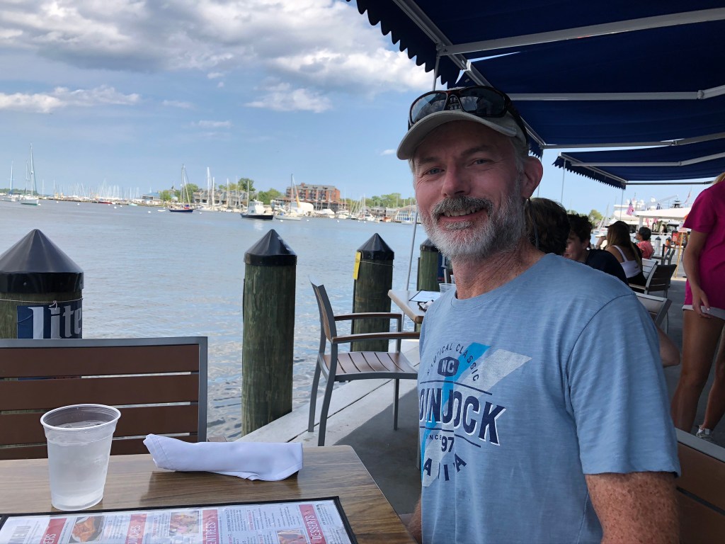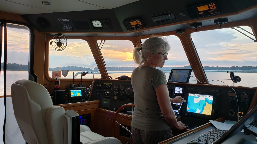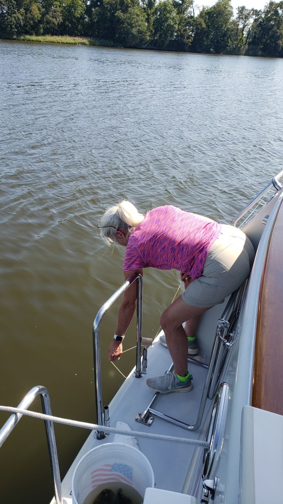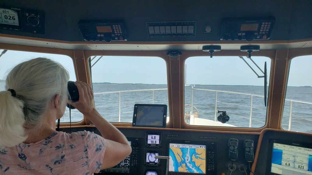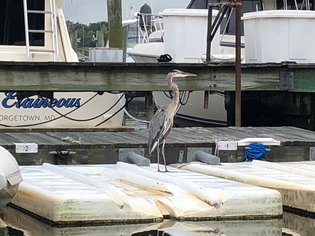 We entered the harbor to Solomons with Neil at the helm. It was a bit tricky as there are several marinas here and a confusing array of navigational buoys/day markers (i.e. when Kathleen contacted the Calvert Marina harbormaster to request directions to our slip, he asked where we were. She responded, “we just passed marker Red 4.” His response was, “Well there are a couple of Red 4’s, but ok). We got to where we needed to be, and were once more on a facing dock, this time between two other boats. Neil turned the boat 90 degrees, and moving astern basically parallel parked our 50 foot boat while Kathleen called out directions, closing distances and speed for him. Teamwork!