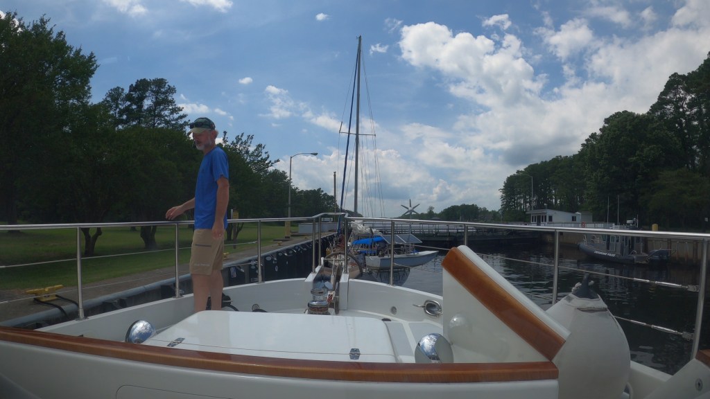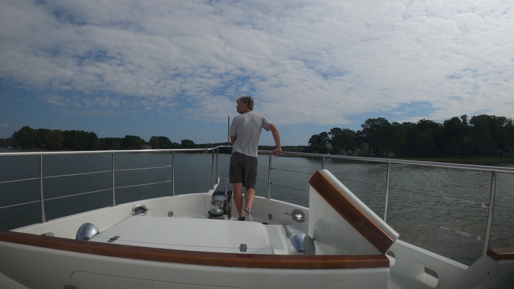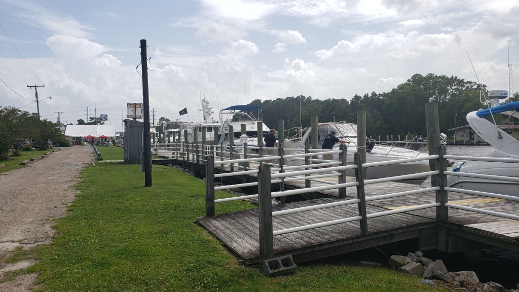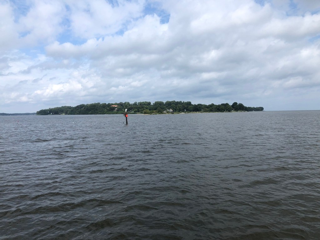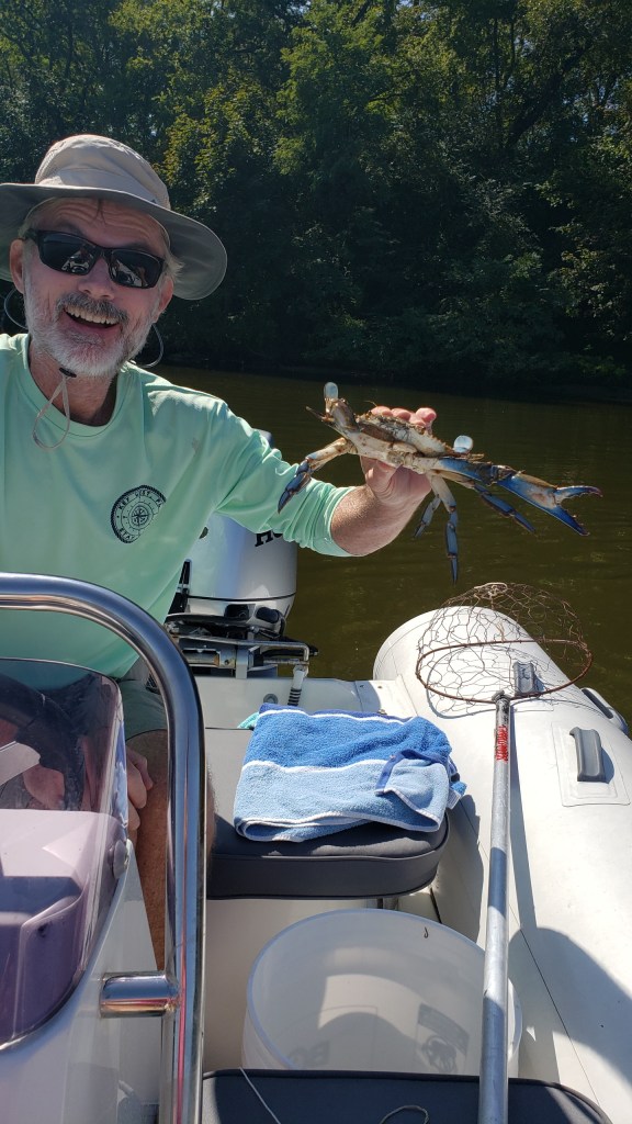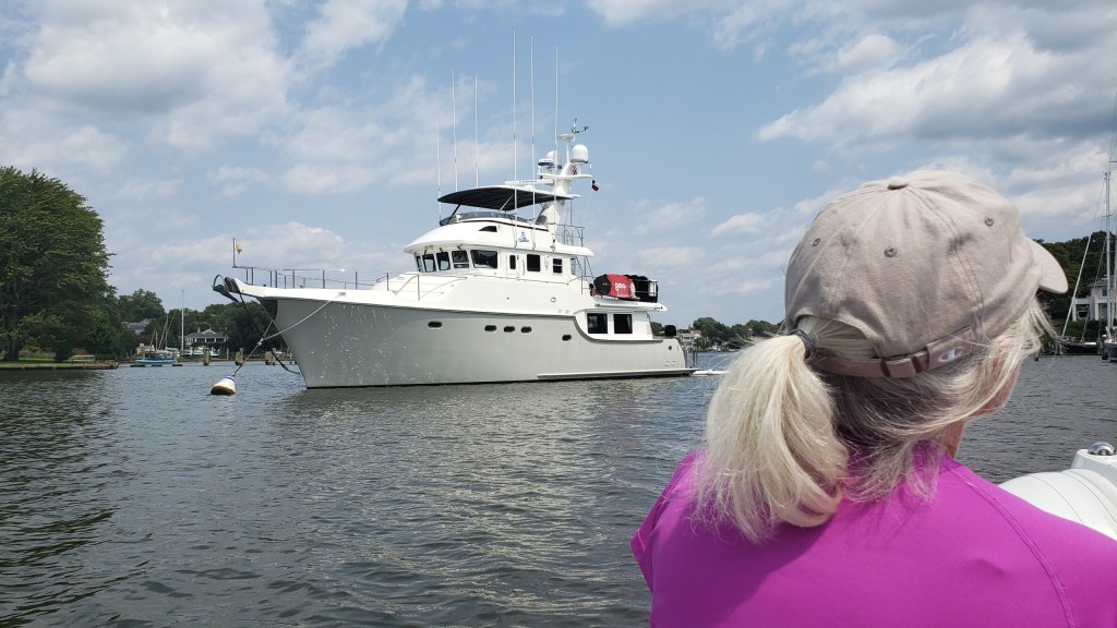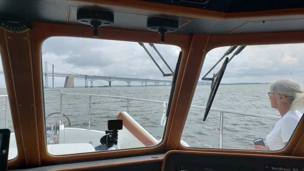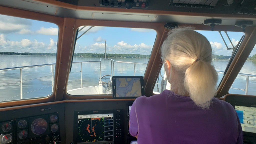 We entered the harbor to Solomons with Neil at the helm. It was a bit tricky as there are several marinas here and a confusing array of navigational buoys/day markers (i.e. when Kathleen contacted the Calvert Marina harbormaster to request directions to our slip, he asked where we were. She responded, “we just passed marker Red 4.” His response was, “Well there are a couple of Red 4’s, but ok). We got to where we needed to be, and were once more on a facing dock, this time between two other boats. Neil turned the boat 90 degrees, and moving astern basically parallel parked our 50 foot boat while Kathleen called out directions, closing distances and speed for him. Teamwork!