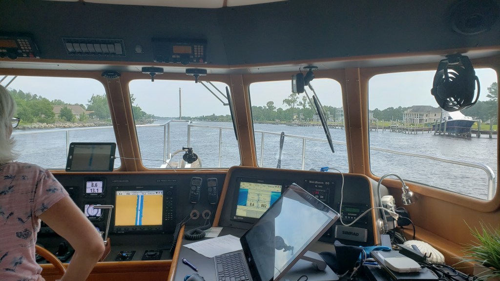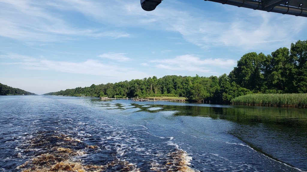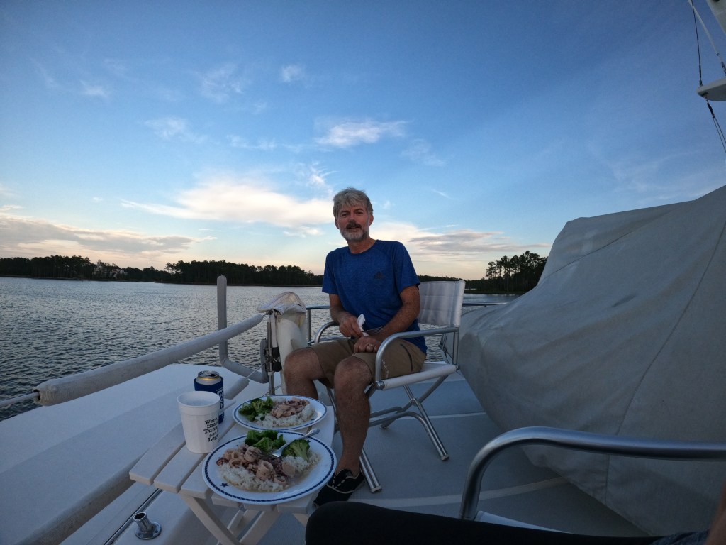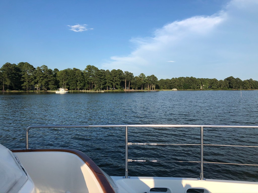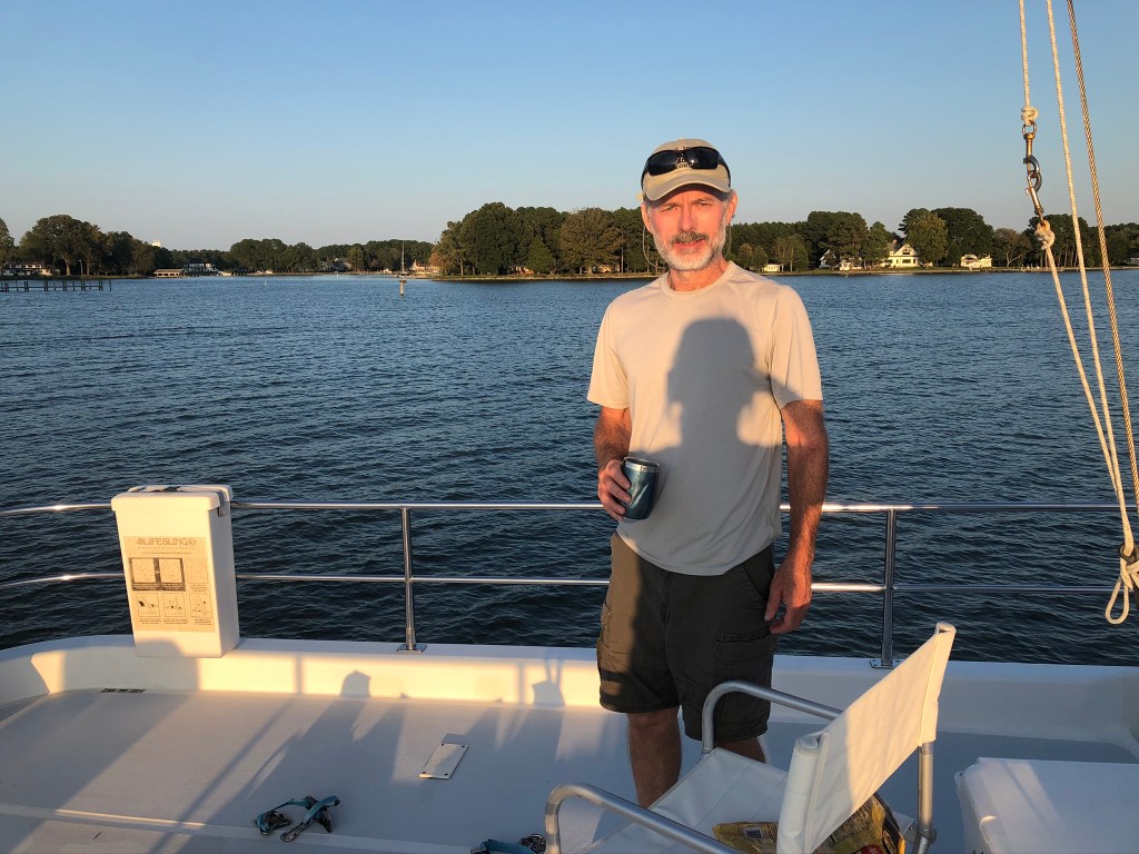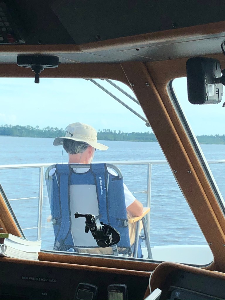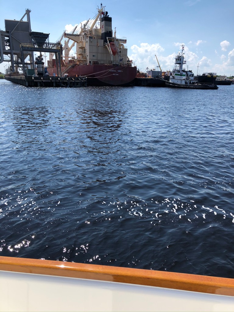 We entered the harbor to Solomons with Neil at the helm. It was a bit tricky as there are several marinas here and a confusing array of navigational buoys/day markers (i.e. when Kathleen contacted the Calvert Marina harbormaster to request directions to our slip, he asked where we were. She responded, “we just passed marker Red 4.” His response was, “Well there are a couple of Red 4’s, but ok). We got to where we needed to be, and were once more on a facing dock, this time between two other boats. Neil turned the boat 90 degrees, and moving astern basically parallel parked our 50 foot boat while Kathleen called out directions, closing distances and speed for him. Teamwork!