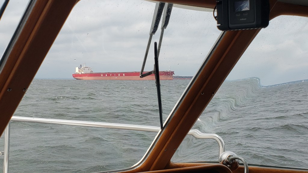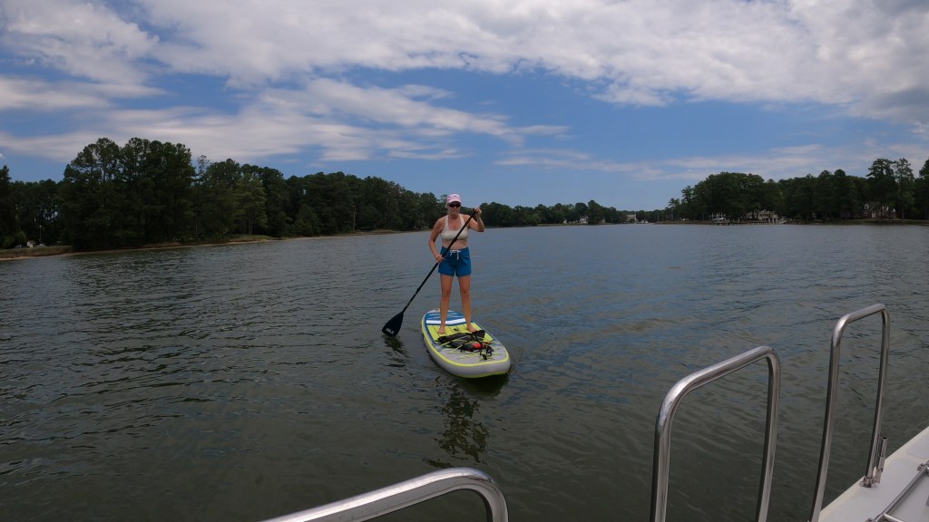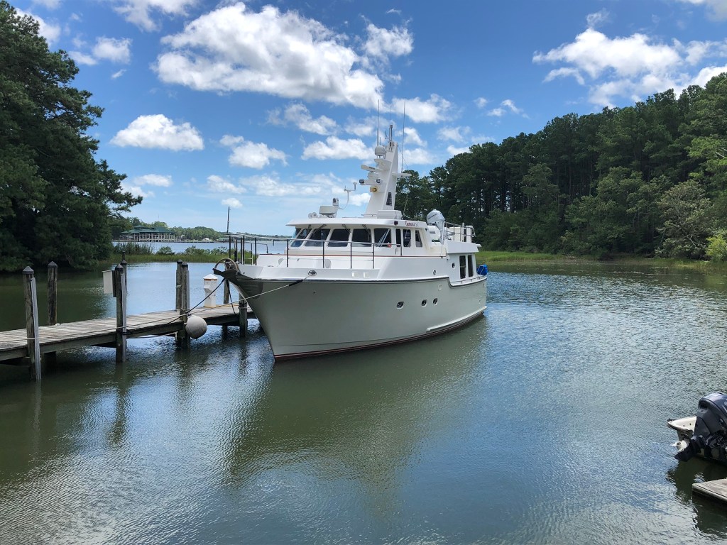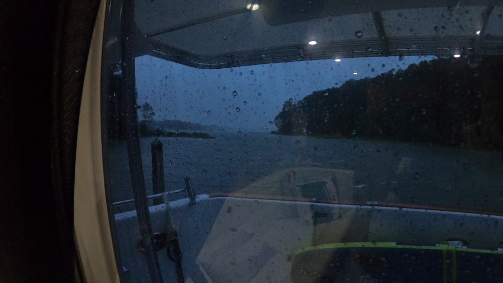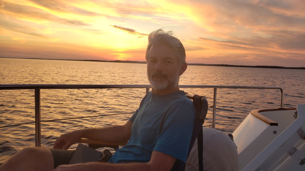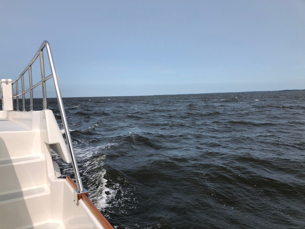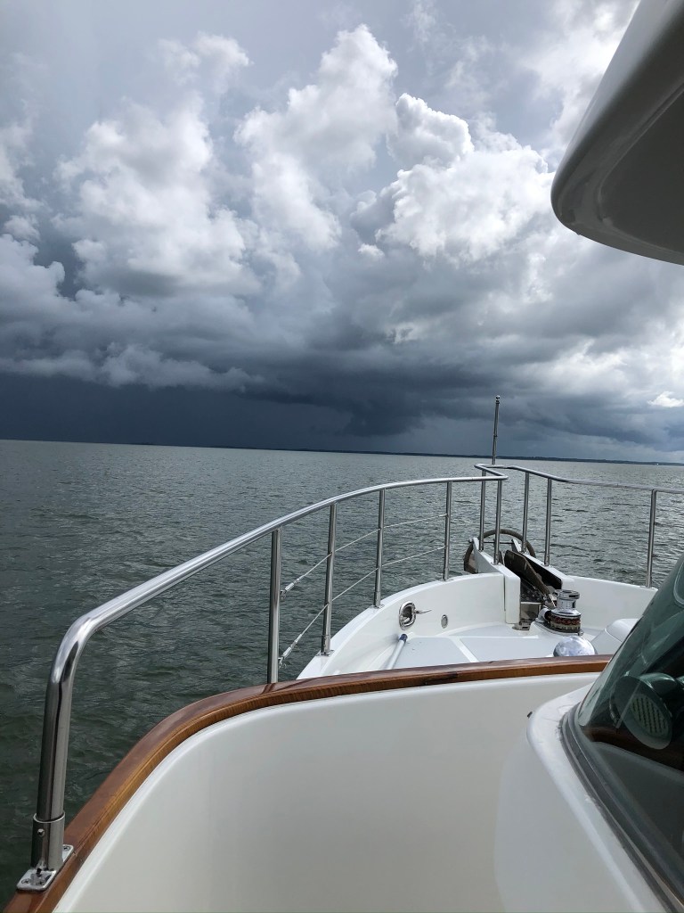 We entered the harbor to Solomons with Neil at the helm. It was a bit tricky as there are several marinas here and a confusing array of navigational buoys/day markers (i.e. when Kathleen contacted the Calvert Marina harbormaster to request directions to our slip, he asked where we were. She responded, “we just passed marker Red 4.” His response was, “Well there are a couple of Red 4’s, but ok). We got to where we needed to be, and were once more on a facing dock, this time between two other boats. Neil turned the boat 90 degrees, and moving astern basically parallel parked our 50 foot boat while Kathleen called out directions, closing distances and speed for him. Teamwork!