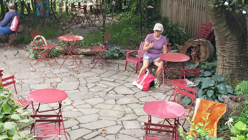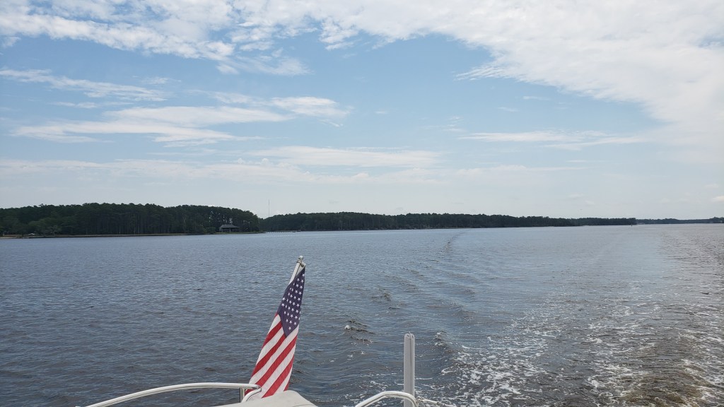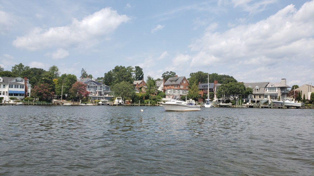 We lowered the dinghy and cruised up to the public dinghy dock, and walked the quarter mile back into St. Michaels. As it was later in the day, we just strolled around, stopping in the small local market for important items like chips and beer. We went back to the dinghy, noticing the beautiful colonial homes lining the areas away from the main street. People take great pride in their homes and yards, and the neighborhoods are welcoming. One home had an out-of-this-world garden, where strangers were encouraged to visit. It was funky and fun and beautiful, and Kathleen could not imagine how much time and effort went into creating and keeping up this treasure. We got back to the boat with time to spare to enjoy a cocktail on the rear deck enjoying the view. Oh, and there were eagles again!