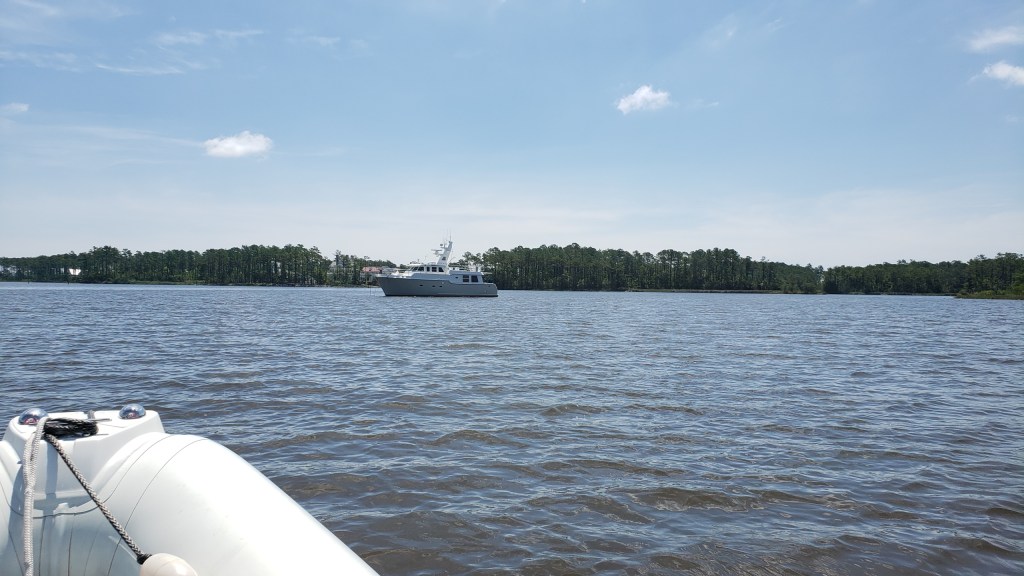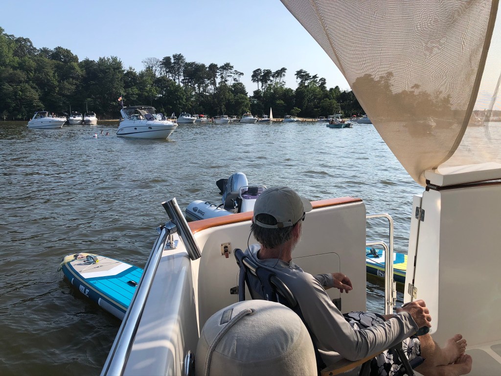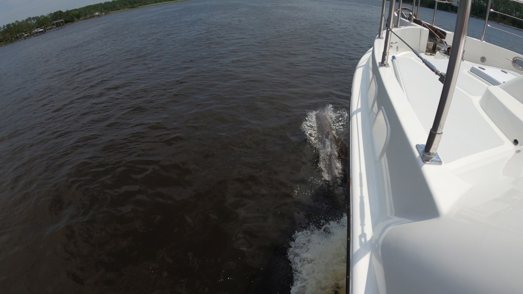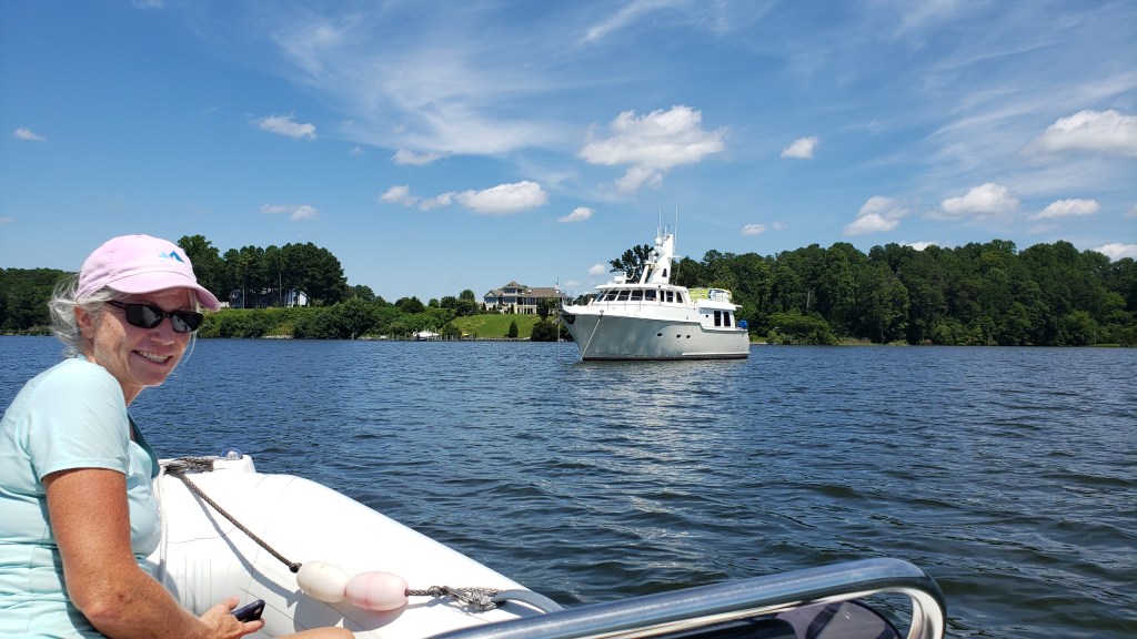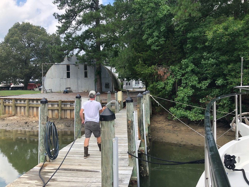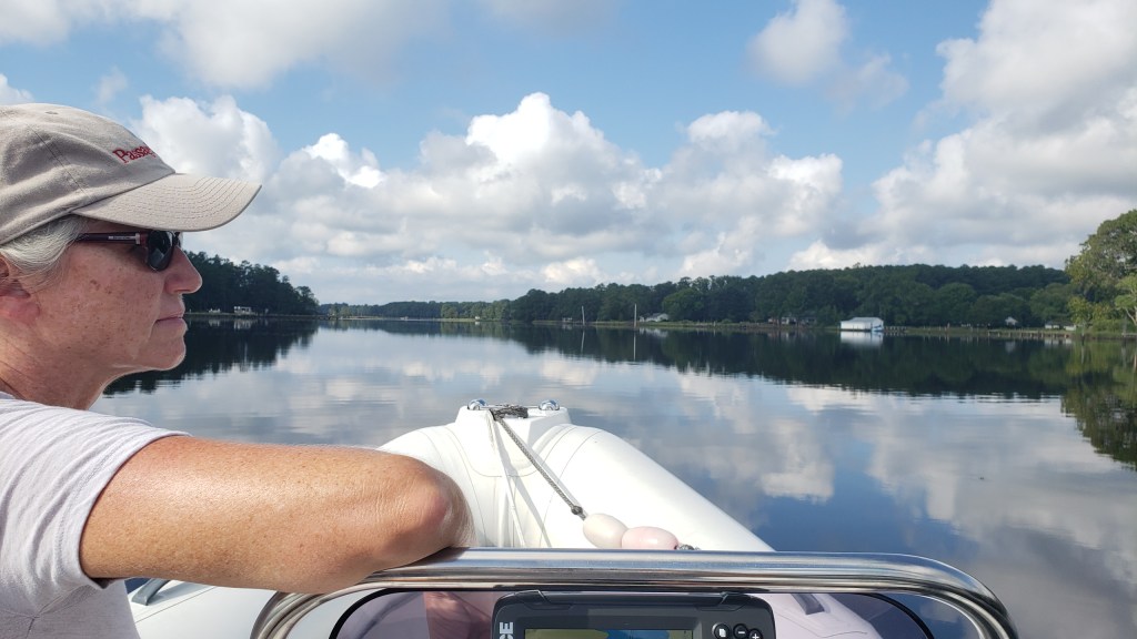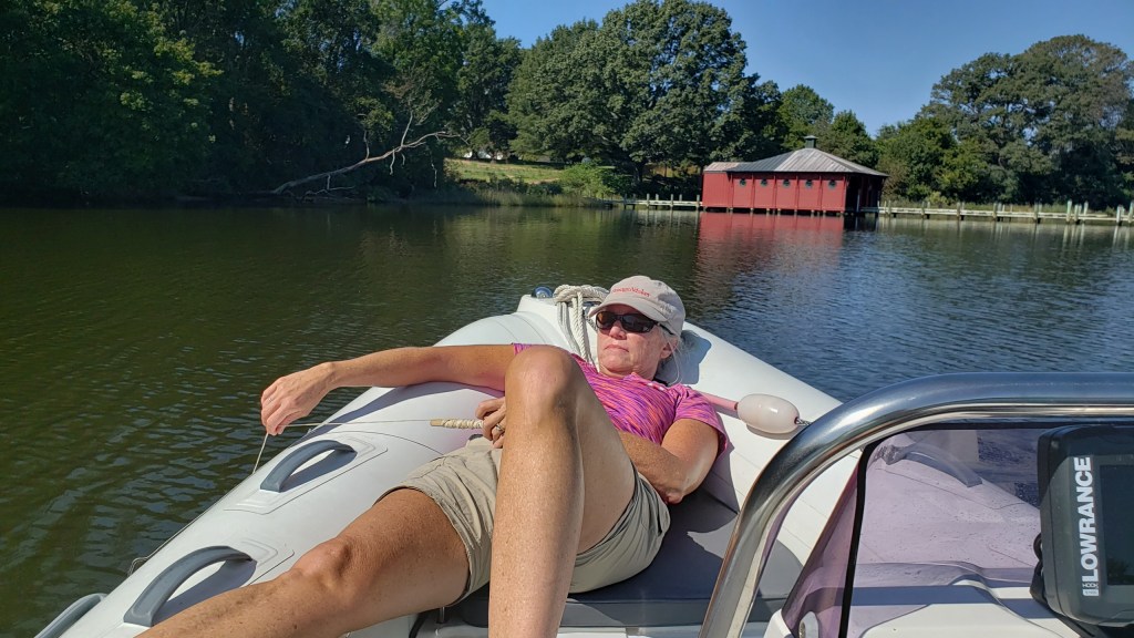 After grabbing some lunch, we returned to the dinghy and headed back to the boat. Neil decided to try the hookah (no, not that kind, a dive system that uses an electric air pump, 50’ of hose, and a regulator to allow one to dive without tanks). He geared up in a snazzy wetsuit (initially bought to avoid jellyfish, but never used for such as the water had been too warm to wear), swim mask, fins and flashlight, and jumped in to check out our zincs on the hull. (Zincs are sacrificial anodes affixed to the hull, shafts, thrusters, etc to reduce corrosion, and have to be replaced from time to time). Although the hookah worked as planned, Neil couldn’t see six inches in front of his face as the brackish water was too murky. So, after a short test/play in the water, we called it quits on this venture, and decided to hire a diver to check out the zincs and clean the hull in Solomon’s Island, a later intended stop.