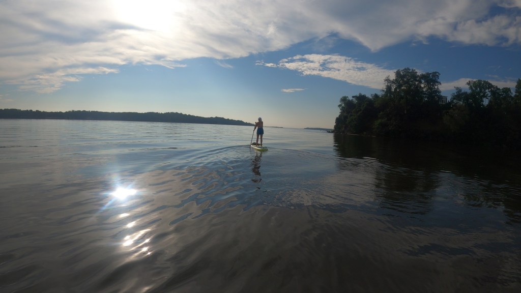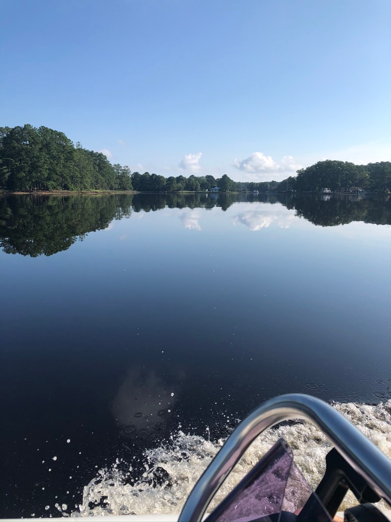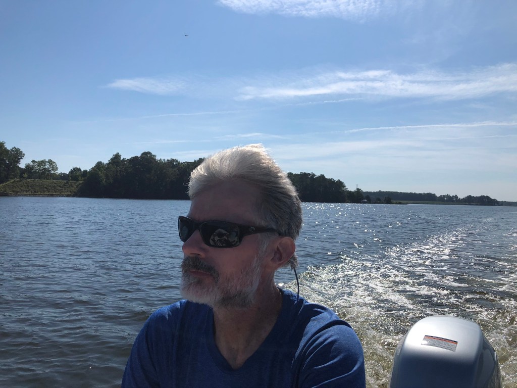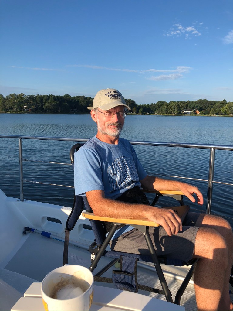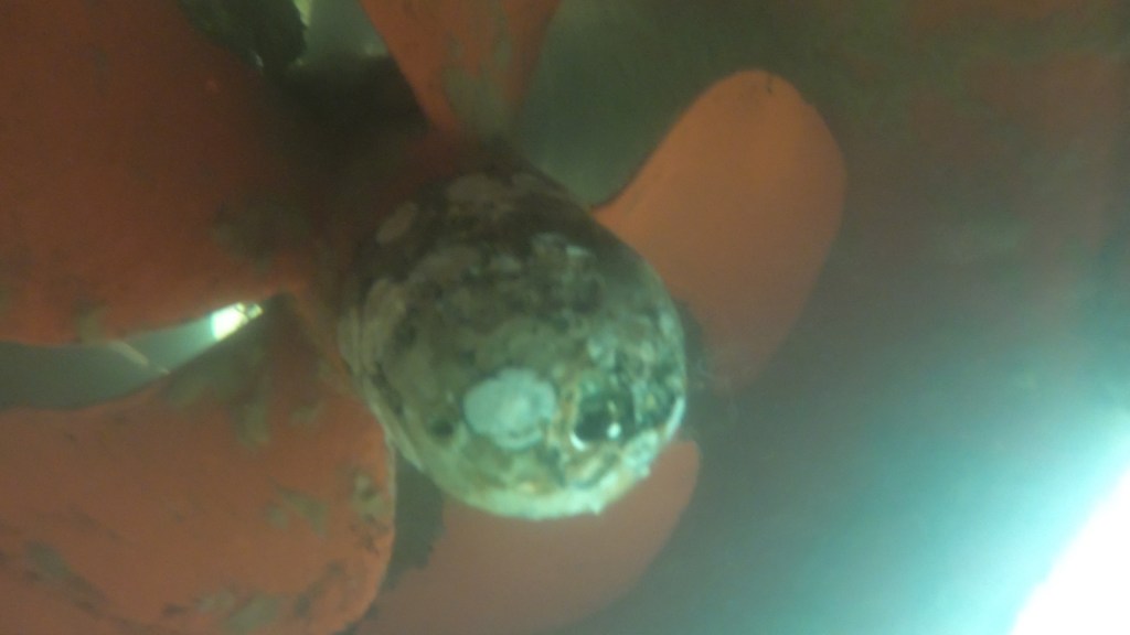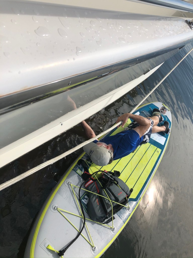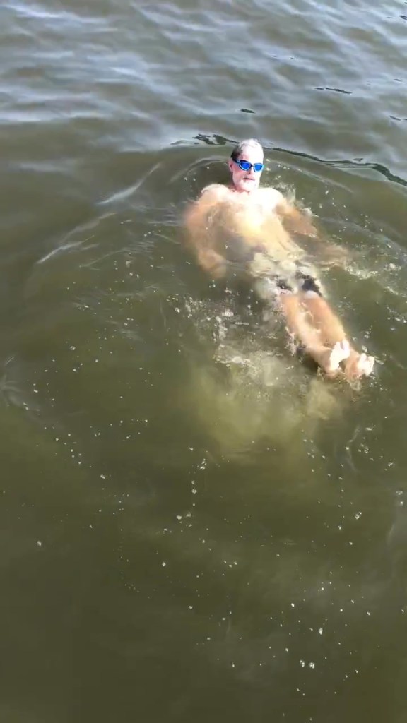 After grabbing some lunch, we returned to the dinghy and headed back to the boat. Neil decided to try the hookah (no, not that kind, a dive system that uses an electric air pump, 50’ of hose, and a regulator to allow one to dive without tanks). He geared up in a snazzy wetsuit (initially bought to avoid jellyfish, but never used for such as the water had been too warm to wear), swim mask, fins and flashlight, and jumped in to check out our zincs on the hull. (Zincs are sacrificial anodes affixed to the hull, shafts, thrusters, etc to reduce corrosion, and have to be replaced from time to time). Although the hookah worked as planned, Neil couldn’t see six inches in front of his face as the brackish water was too murky. So, after a short test/play in the water, we called it quits on this venture, and decided to hire a diver to check out the zincs and clean the hull in Solomon’s Island, a later intended stop.