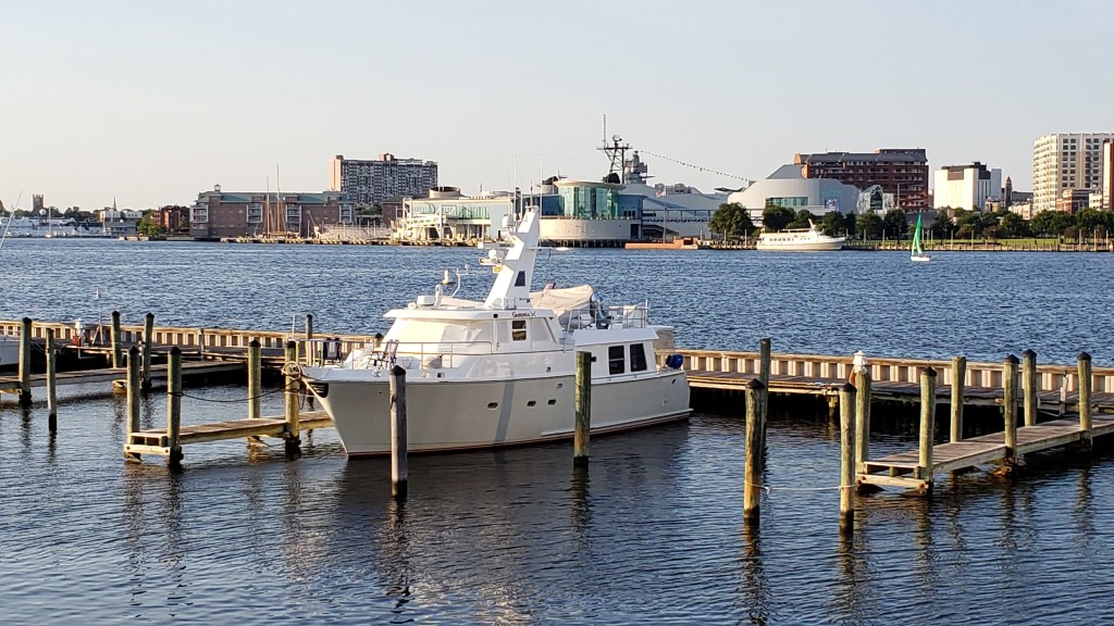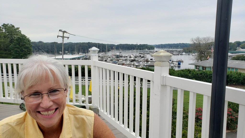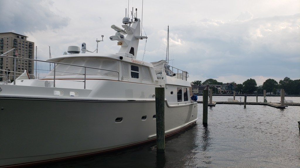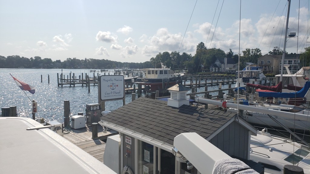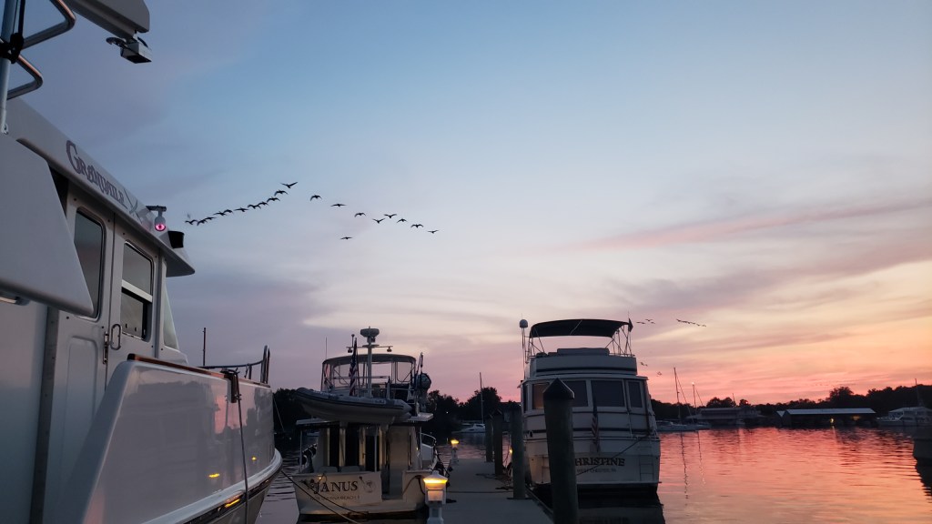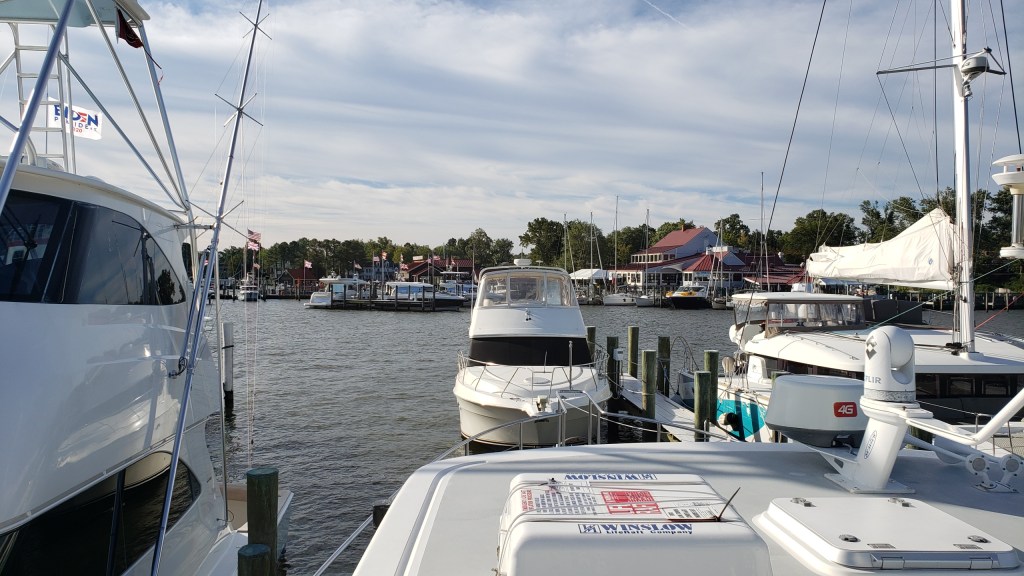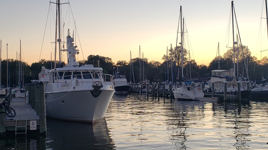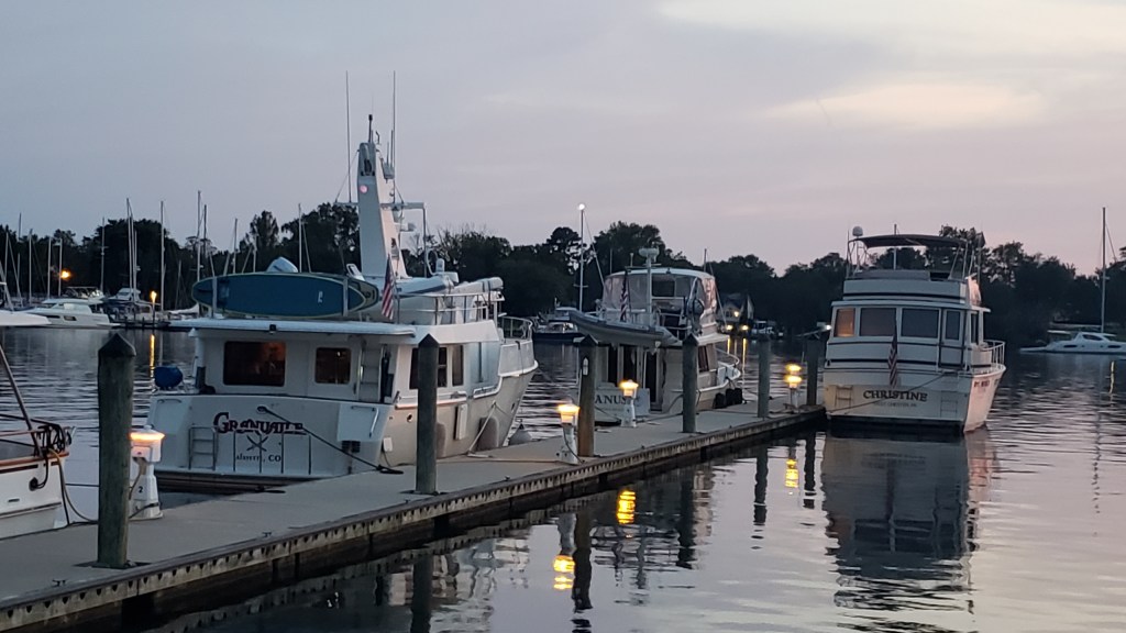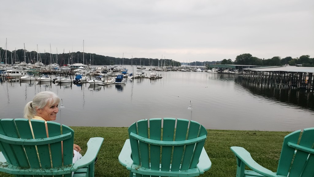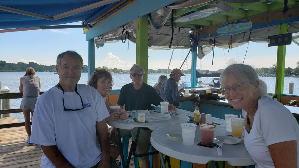 Back to our journey… once we arrived at the marina in Cambridge, we initially tied up to the fuel dock to pump out the holding tank. While undertaking this job, we were hailed by some familiar voices on the dock and saw Frank and Beeb, boating friends we had met in Vero Beach! It was a terrific surprise to be at the same marina, and spent the afternoon with them catching up. After leaving them, we went for a relaxed dinner at a nearby restaurant.