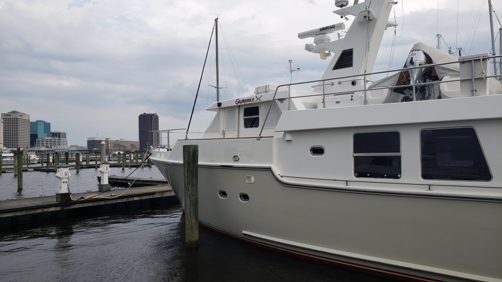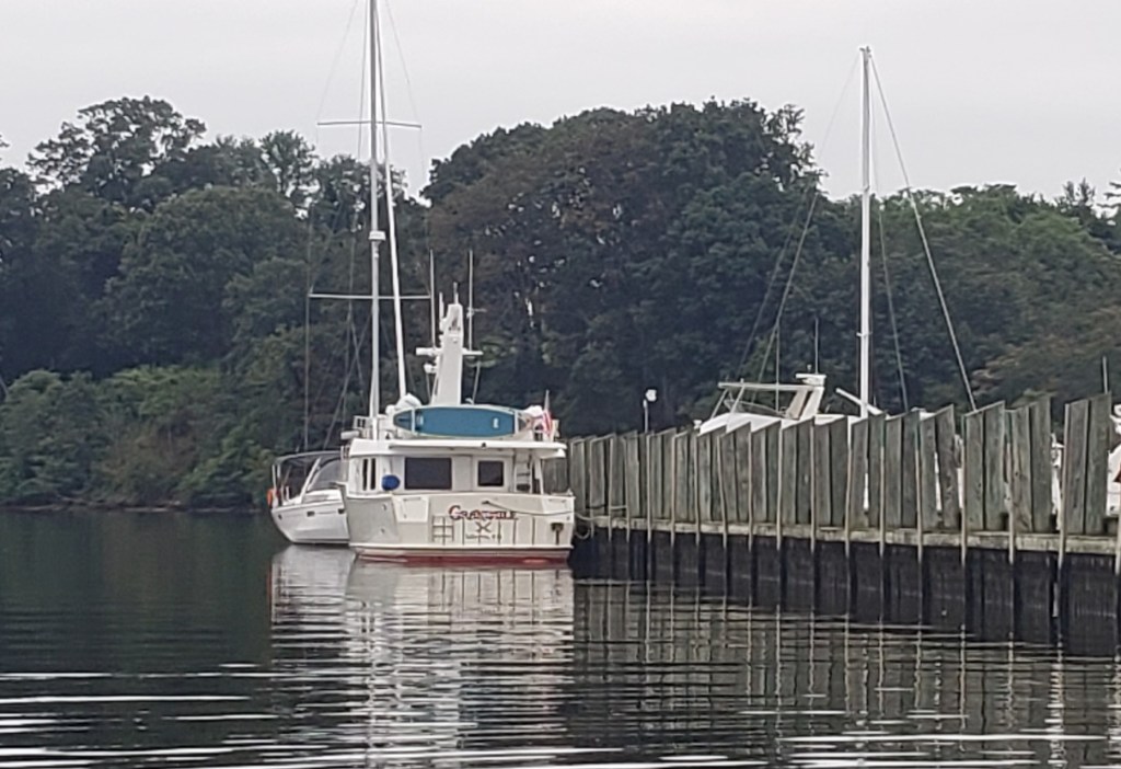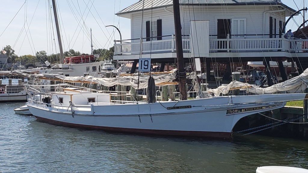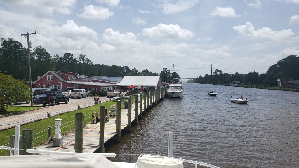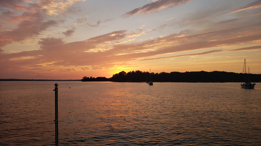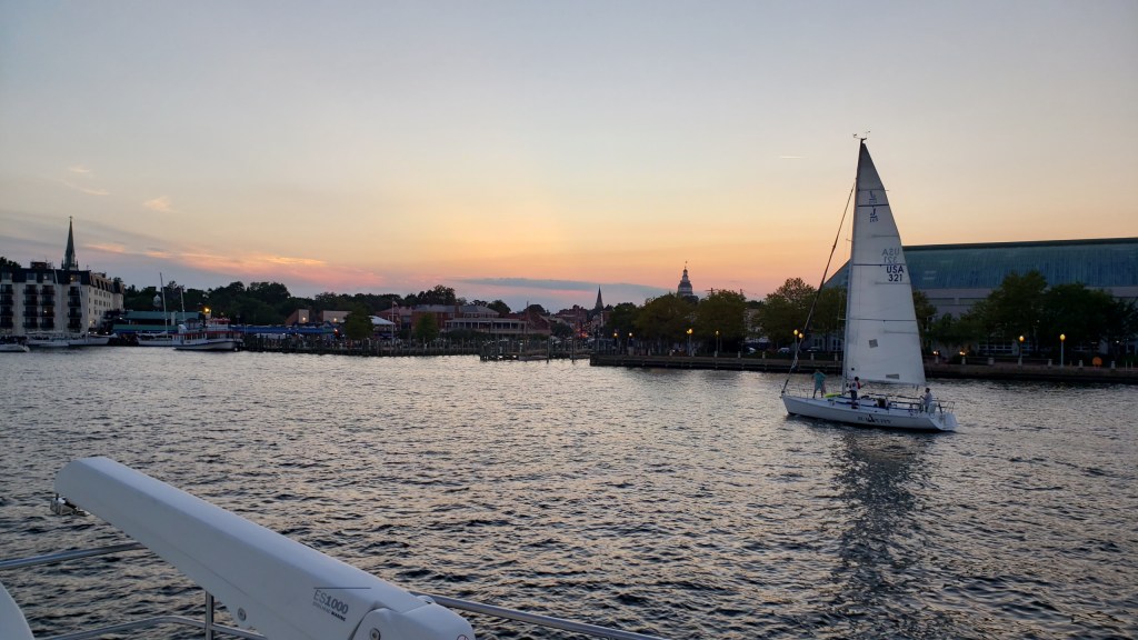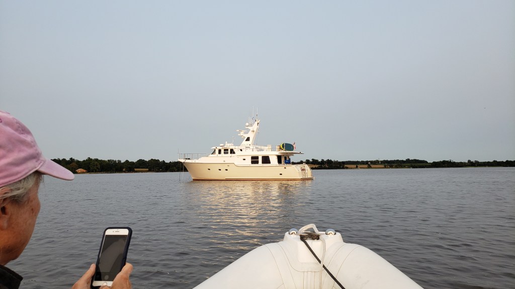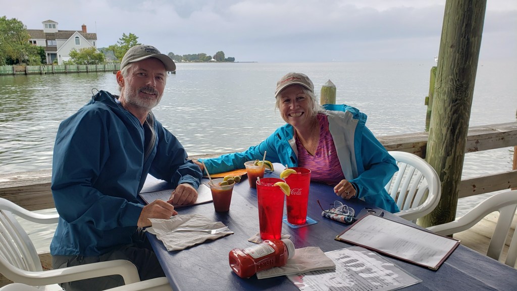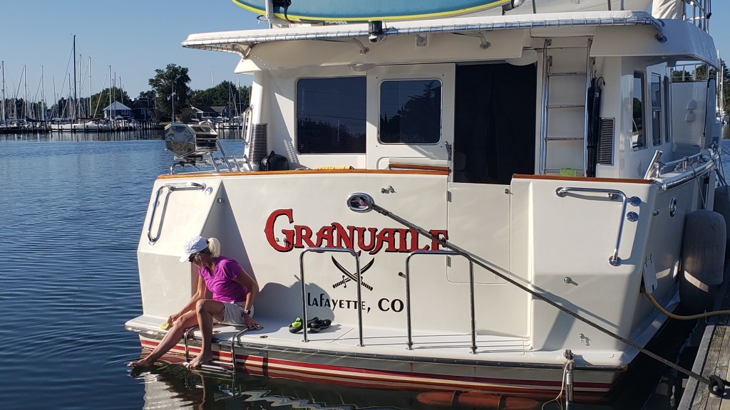 Back to our journey… once we arrived at the marina in Cambridge, we initially tied up to the fuel dock to pump out the holding tank. While undertaking this job, we were hailed by some familiar voices on the dock and saw Frank and Beeb, boating friends we had met in Vero Beach! It was a terrific surprise to be at the same marina, and spent the afternoon with them catching up. After leaving them, we went for a relaxed dinner at a nearby restaurant.