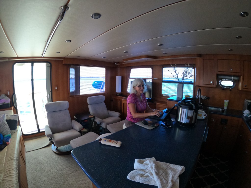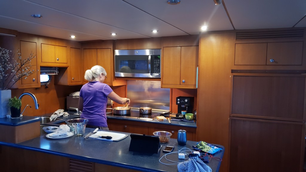 Once all of our groceries were stowed, Kathleen tried her hand at rockfish (which is delicious!) while Neil worked on diagnosing our electronics problems. Suffice it to say that Kathleen had more success.