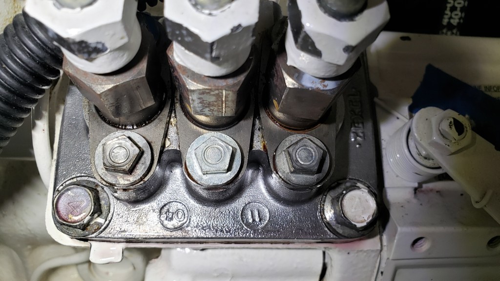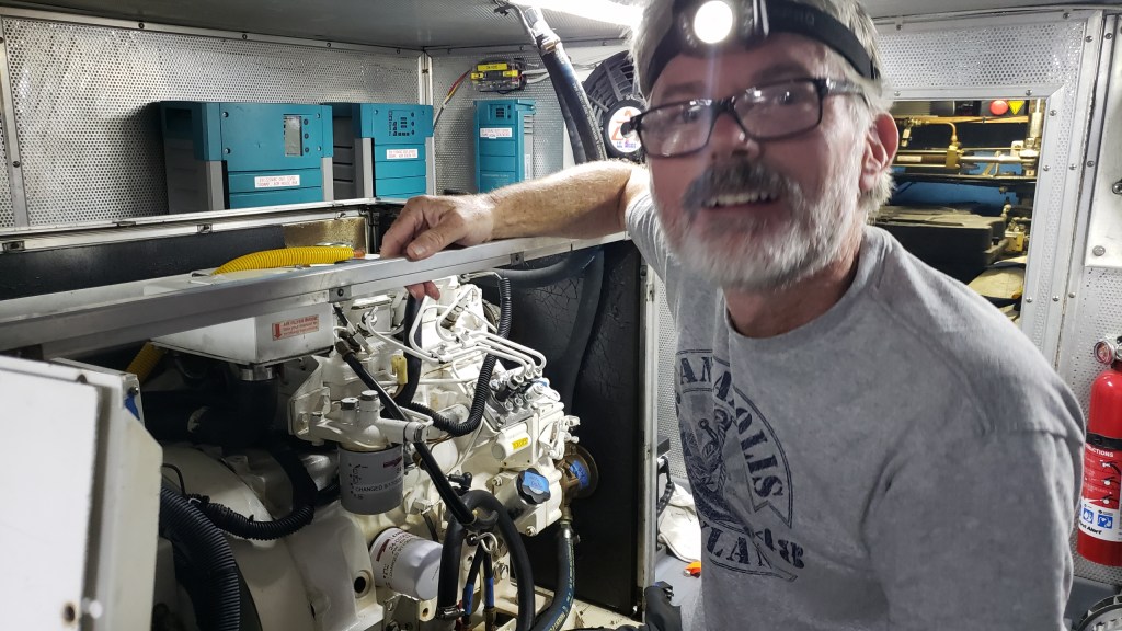 In the middle of this, the previous evening we had difficulty starting the generator (the one Neil had just installed a new fuel pump on). Neil had been starting the generator twice a day even though we were at the dock with shore power, to confirm no further problems before we continued our cruise south. Hoping it was just air in the line, he bled the fuel system again and the generator started fine. Problem seemed to be fixed. Unfortunately in the light of morning, the problem was still lingering, so he had this issue to diagnose and fix also. Turned out that during the fuel injection pump install, Neil had dislodged a connector to the preheat glow plug relay. Quick fix and success, generator now reliably starts.